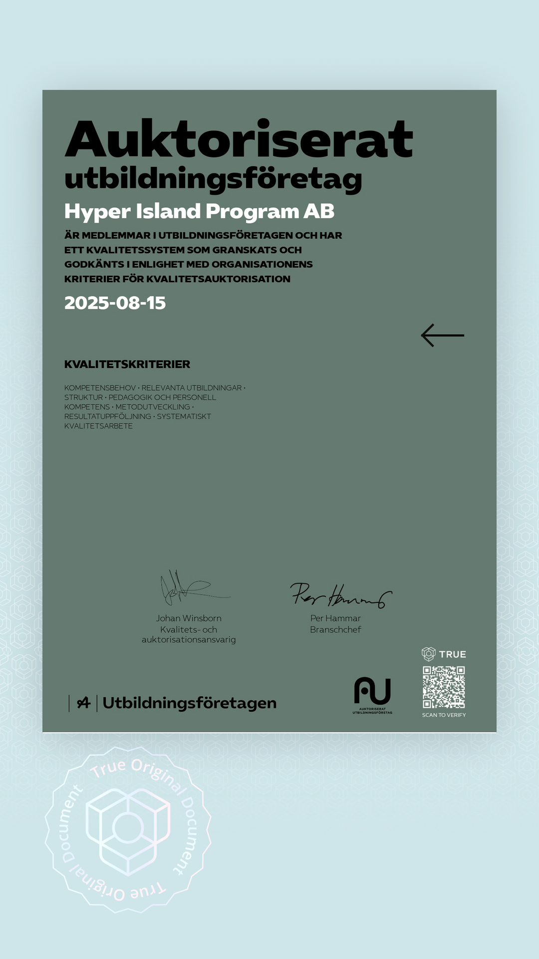The quality authorization is controlled and issued by Utbildningsföretagen. The authorization is valid until further notice and is revised regularly. The date on the certificate indicates when the last audit was approved.