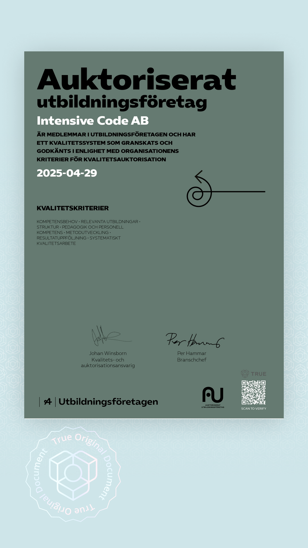 The quality authorization is controlled and issued by Utbildningsföretagen. The authorization is valid until further notice and is revised regularly. The date on the certificate indicates when the last audit was approved.